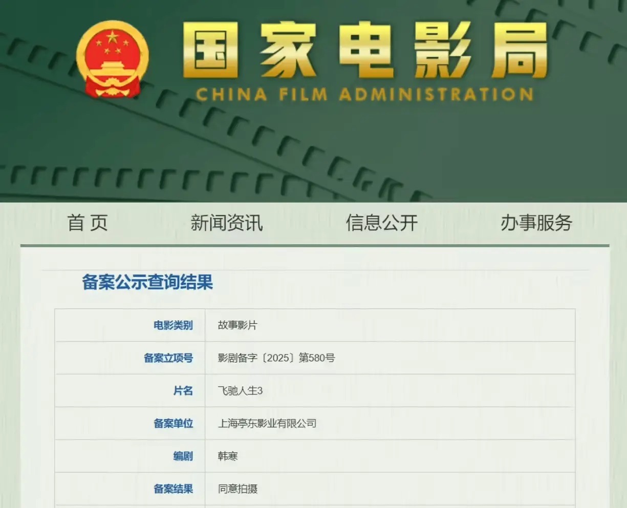 4月10日,国家电影局发布关于2025年3月上旬全国电影剧本(梗概)备案、立项公示的通知。电影《飞驰人生 3》立项,编剧为韩寒。